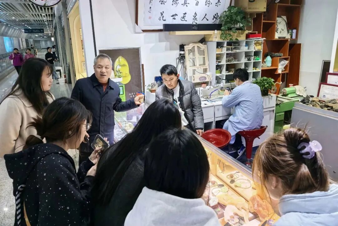 陕西省珠宝玉石首饰行业协会会长同彦庄、雕刻艺术一条街管委会副主任黄树立等热情接待了我校师生。同彦庄给大家介绍了雕刻艺术一条街建设及协会和相关院校产学研合作、大学生在雕刻艺术一条街就业学习期间享受政府补贴等情况,引导师生们有序参观了协会组织的历届珠宝玉石首饰行业职业技能大赛优秀选手作品、陕西优秀雕刻师作品和街区内的玉雕、木雕、石雕、核雕、牙雕、珠宝镶嵌等多个特色工艺工作室,并对不同材质、工种的雕刻技艺、工艺流程及市场发展现状进行了深入浅出的讲解。他强调,珠宝玉石首饰行业的发展离不开年轻力量的加入,希望同学们能通过今天的见学,将课堂理论知识与实操创作相结合,为未来的职业发展打下坚实基础。