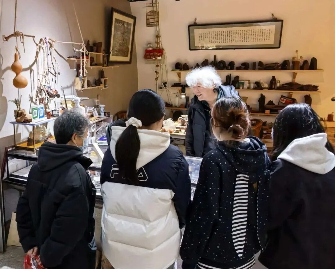 随后,我校师生们深入各个工艺大师工作室进行实地体验实践,近距离观摩了工艺美术大师们的现场创作,观看从一块原料到精美的艺术品,从设计构思到精雕细琢,大师们精湛的技艺和专注的神情深深吸引了在场的每一位同学。同学们就材料选择、工具使用、创作灵感以及行业前景等问题,与大师们进行了热烈的互动交流。