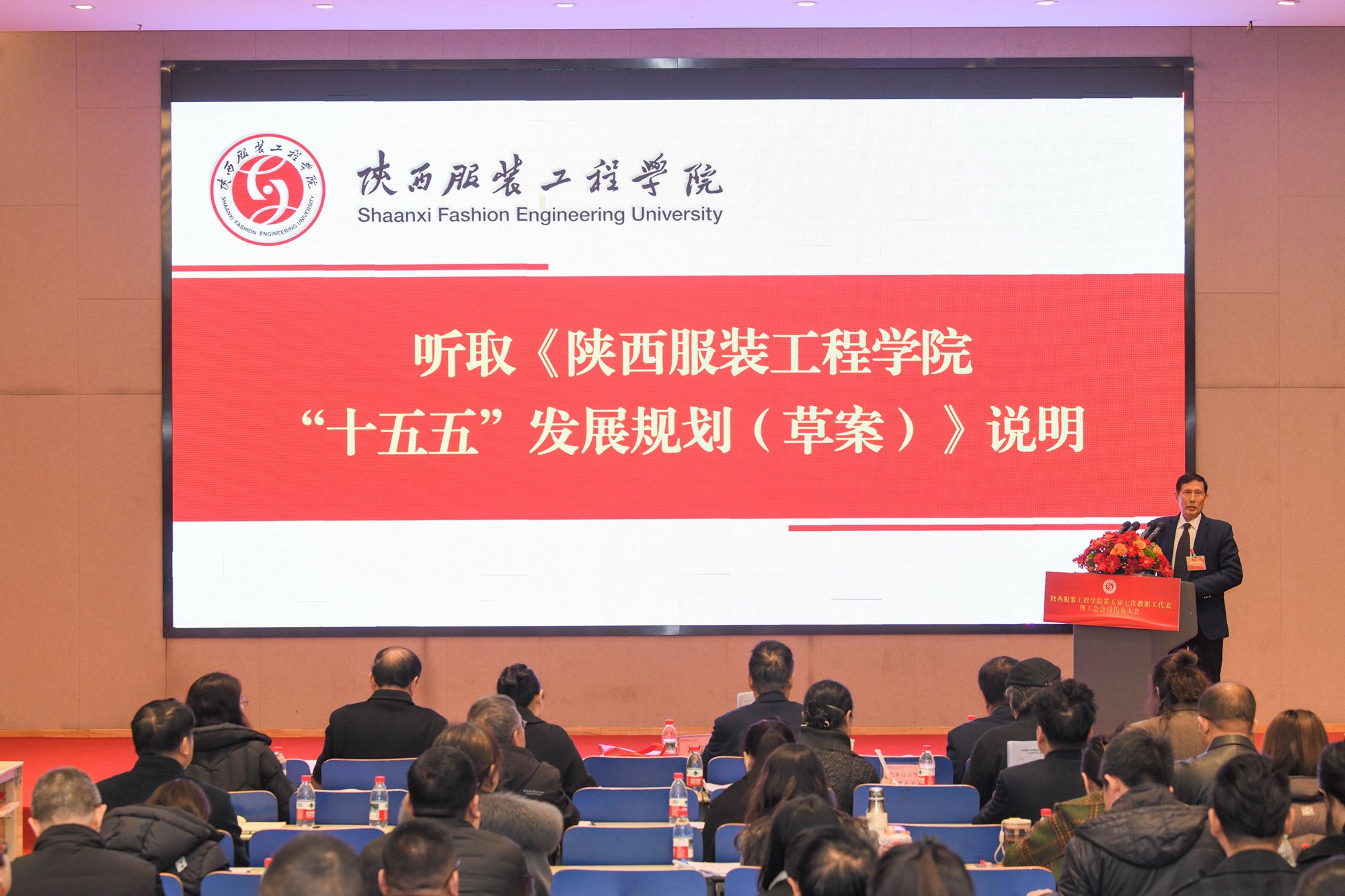 潘庆才作了《陕西服装工程学院“十五五”发展规划(草案)》说明。他围绕“十五五”时期学校发展的基本思路、战略目标、主要任务和保障措施等方面进行了详细阐述,重点解读了未来五年学校在学科建设、师资队伍、人才培养、科研创新及校园基础设施建设等领域的关键指标与实施路径。
