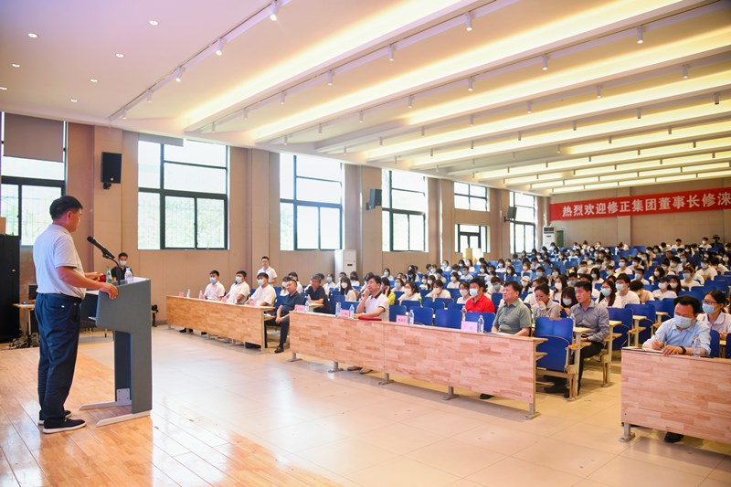 吕明董事长主持报告会并发表讲话,高度评价镐京集团与修正药业集团全面战略合作的重大意义和深远影响,高度称赞修董事长的企业家精神和人生哲学,号召全体陕服师生向修董事长学习,全面推进校企合作,落地落实落细相关措施。