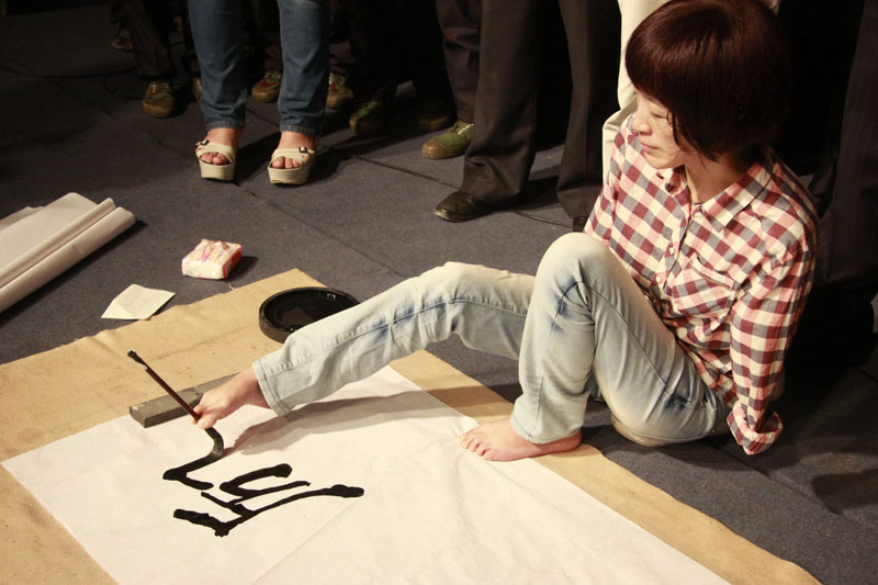 在演讲的最后,李智华老师还用脚夹着毛笔书写了励志践行四个大字,送给我院,以激励同学们。